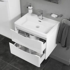 The minimalist 995mm wide wall hung textured walnut basin unit is perfect for adding modern style to any bathroom. Supplied with a smooth white gloss poly-marble basin top and modern chrome handles to complete this clean modish vanity unit. Use with one of our chrome plated exposed bottle traps (sold separately) for a look which is bang on trend.