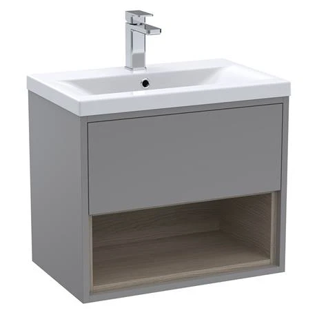 (1) 600mm Matt Grey / Vicenza Oak Wall Hung 1 Drawer Unit with Open Shelf