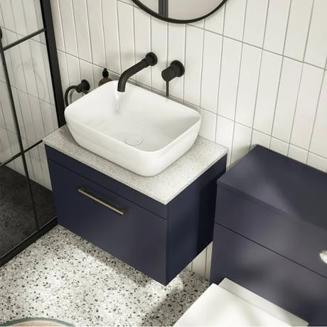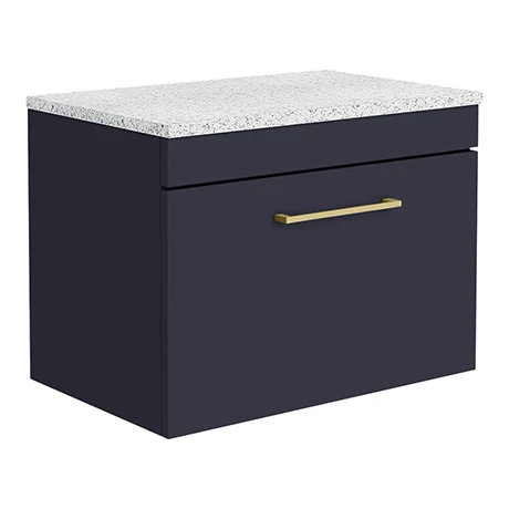 The contemporary matt blue Arezzo furniture range, with it’s clean lines this vanity unit is perfect for renewing the style in any bathroom. Designed for use with a counter top basin (not included), the sparkling white worktop sits perfectly on top and all pipework is neatly concealed within the unit. A soft closing drawer provides generous storage space for your toiletries, helping to keep your bathroom clutter free. Features a eye-catching stylish matt blue finish with a on-trend modern brushed brass square bar handle.