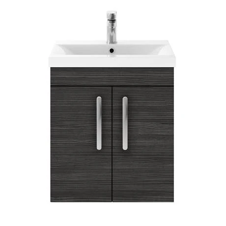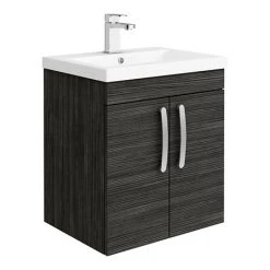The Brooklyn Black Woodgrain modular furniture range combines up to date looks with practical storage. Features 2 soft close doors and provides plenty of storage space for toiletries, the Brooklyn wall hung vanity unit is perfect for adding modern style to any bathroom. This high quality Black Woodgrain textured wood effect vanity unit is supplied with a smooth white gloss vitreous china basin. All units are provided with quality matt chrome handles.