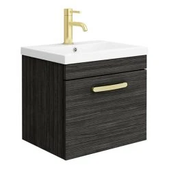 The Brooklyn modular furniture range combines up to date looks with practical storage. Features a soft closing drawer providing plenty of space for toiletries, the Brooklyn wall hung vanity unit is perfect for adding modern style to any bathroom. This high quality black textured wood effect vanity unit is supplied with a smooth white gloss vitreous china basin and a quality brushed brass handle.