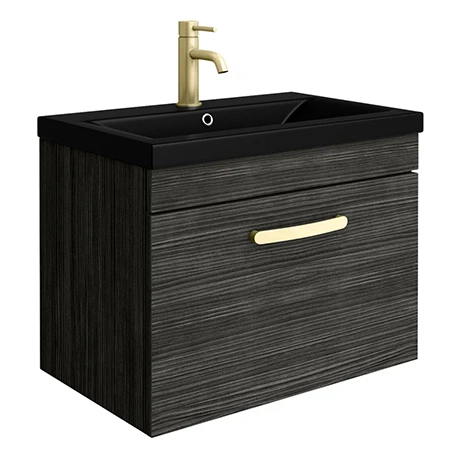 The Brooklyn modular furniture range combines up to date looks with practical storage. Features a soft closing drawer providing plenty of space for toiletries, the Brooklyn wall hung vanity unit is perfect for adding modern style to any bathroom. This high quality black textured wood effect vanity unit is supplied with a smooth matt black vitreous china basin and a quality brushed brass handle.