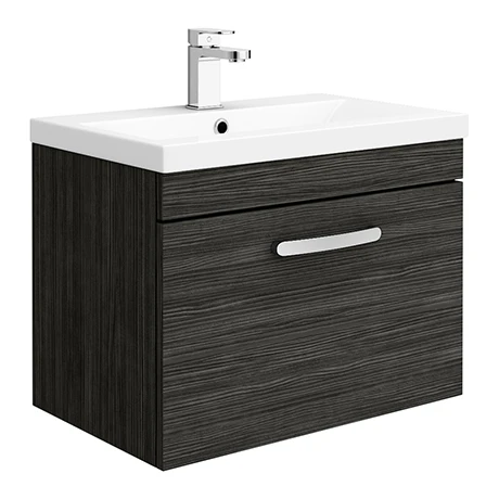 This high quality Black textured wood effect vanity unit is supplied with a smooth white gloss vitreous china basin.