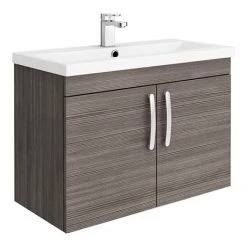The Brooklyn Grey Avola modular furniture range combines up to date looks with practical storage. Features 2 soft close doors and provides plenty of storage space for toiletries, the Brooklyn wall hung vanity unit is perfect for adding modern style to any bathroom. This high quality grey avola textured wood effect vanity unit is supplied with a smooth white gloss vitreous china basin. All units are provided with quality matt chrome handles.