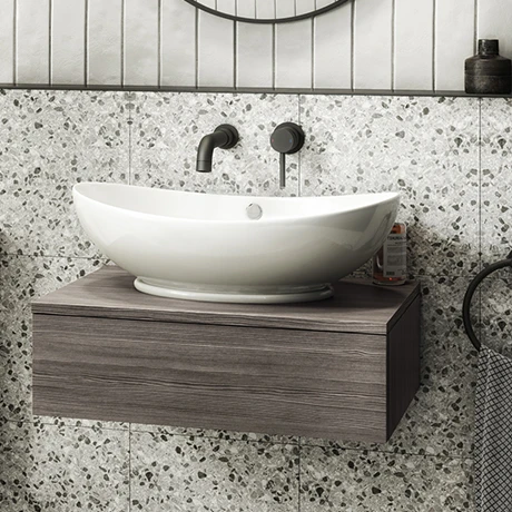 Finished in high quality grey brown avola textured wood effect and with it’s clean lines this vanity unit is perfect for renewing the style in any bathroom. Supplied with a gloss white gloss white oval counter top basin, it’s stylish modern design hides all unsightly pipework creating a neat modern look. A soft closing drawer provides generous storage space for your toiletries, helping to keep your bathroom clutter free. Unit features a eye-catching stylish textured wood effect finish, basin has been designed for use with extended tall basin mixers or wall basin mixers.