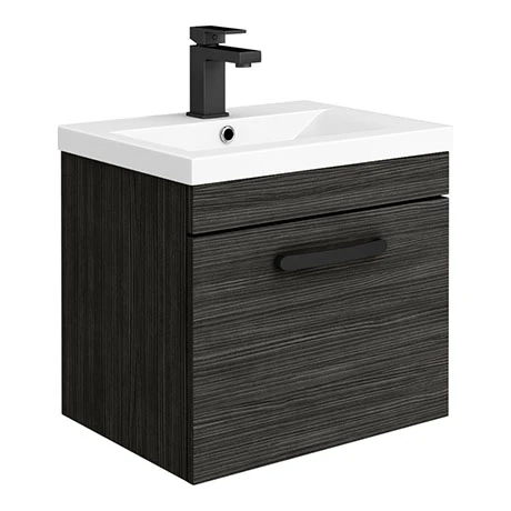 The Brooklyn modular furniture range combines up to date looks with practical storage. Features a soft closing drawer providing plenty of space for toiletries, the Brooklyn wall hung vanity unit is perfect for adding modern style to any bathroom. This high quality black textured wood effect vanity unit is supplied with a smooth white gloss vitreous china basin and a quality matt black handle.