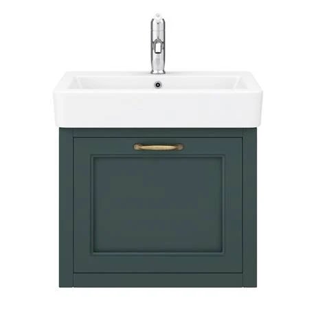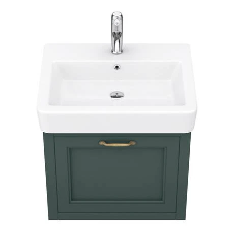 Sleek and sophisticated, our Chatsworth Traditional Green Vanity Unit has a handy drawer that’s perfect for storing your toiletries – it’s even soft close too, so it won’t slam shut. The bathroom vanity unit measures 560mm wide and is wall hung, leaving you extra storage space on the floor underneath. Crafted from durable ceramic with satin green wood panelling, this piece has a sturdy brass oxide handle for a classic look that will last.
