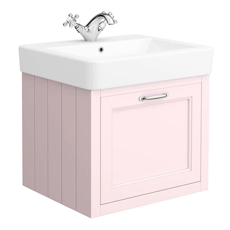Sleek and sophisticated, our Chatsworth Traditional Pink Vanity Unit has a handy drawer that’s perfect for storing your toiletries – it’s even soft close too, so it won’t slam shut. The bathroom vanity unit measures 560mm wide and is wall hung, leaving you extra storage space on the floor underneath. Crafted from durable ceramic with satin pastel pink wood panelling, this piece has a sturdy polished chrome handle for a classic look that will last.