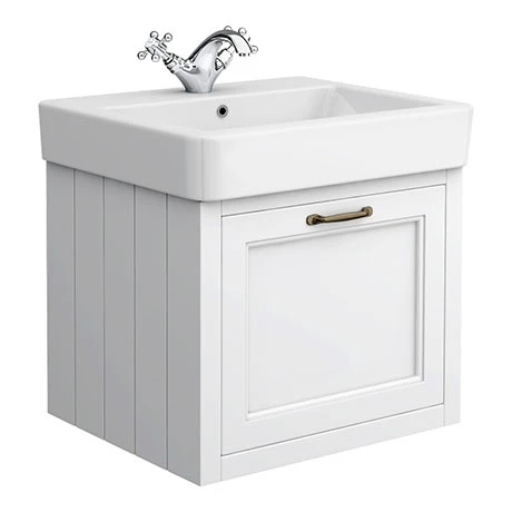 Sleek and sophisticated, our Chatsworth Traditional White Vanity Unit has a handy drawer that’s perfect for storing your toiletries – it’s even soft close too, so it won’t slam shut. The bathroom vanity unit measures 560mm wide and is wall hung, leaving you extra storage space on the floor underneath. Crafted from durable ceramic with gloss white wood panelling, this piece has sturdy brass oxide handles for a classic look that will last.