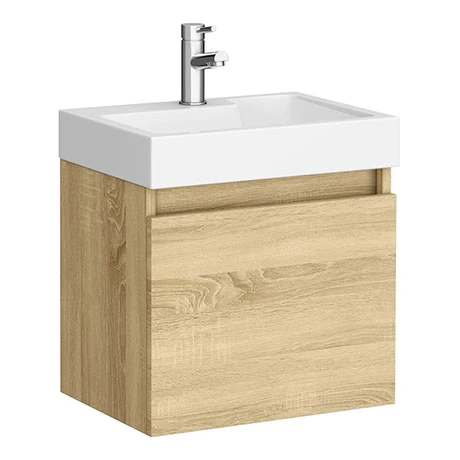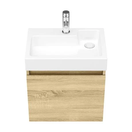 The minimalist Milan Juno space-saving wood effect wall hung vanity unit is ideal for adding a modern designer touch to any bathroom. Features a spacious highly practical soft closing cupboard door and a offset design polymarble basin which provides a ledge for your bathroom toiletries. The Milan Juno wall hung furniture range is great for giving the illusion of a bigger bathroom. The unit features a soft close door which limits the daily wear and tear and provides a quieter closing action.