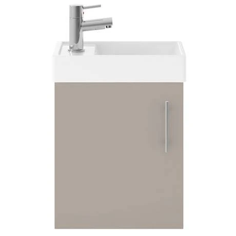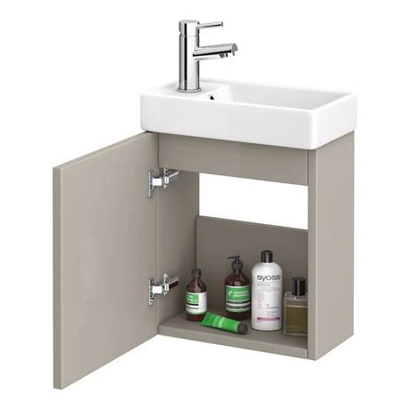 A elegant stone grey compact wall hung vanity unit, perfect for cloakrooms or en-suites. This quality wall hanging cabinet comes with a contemporary chrome handle and provides practical storage. Unit has a soft close door which limits the daily wear and tear and provides a quieter closing action.