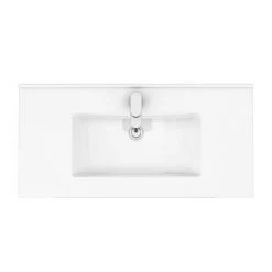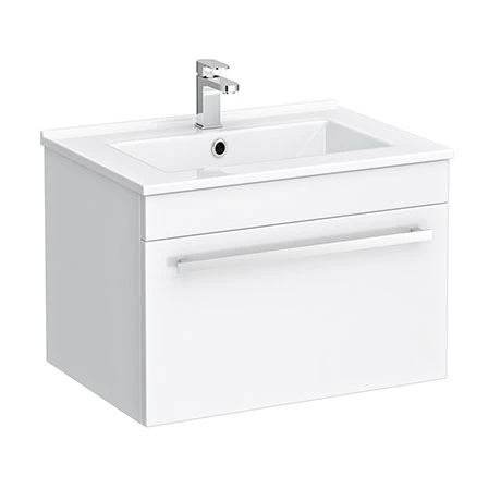 Add a boutique hotel feel to your bathroom with the Nova Wall Hung Vanity Sink With Cabinet. This 505mm wide gloss white vanity unit features a minimalist rectangular basin that adds a sleek look to your space. The slimline sink is crafted from robust ceramic for daily use. Open the drop down cupboard door of the wall hung vanity unit to reveal a convenient storage space – handy for keeping your toiletries neatly organised. Moisture resistant MDF prevents damage from spills and splashes, while a modern matt aluminium bar handle completes the contemporary aesthetic.