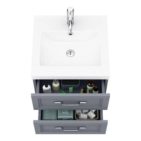Provide a beautiful finishing touch in your bathroom with the Period Bathroom Company traditional 500mm compact 2 drawer wall hung satin grey vanity unit with gloss white basin top. Victorian inspired design with a modern twist, a great alternative to the basin and pedestal, The Period Bathroom Company’s range of charming wall hung bathroom furniture features classic styling with a satin finish cabinet and a traditional polished chrome strap design handle. The 2 soft-close drawers eliminates slams and provides generous storage space for your toiletries, helping to keep your bathroom clutter free.