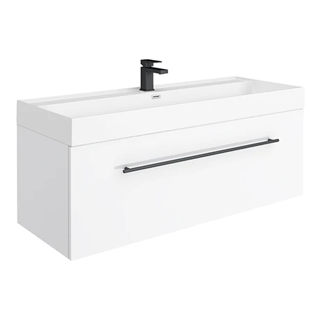 The stylish Valencia 1200mm large vanity unit, it’s wall hung design is great for giving the illusion of a bigger bathroom. Features a durable gloss white cabinet with modern matt black handle and a thin edged white gloss polymarble basin. Add innovative sleek design to your bathroom with the minimalist Valencia furniture range, ideal for making a statement in any modern bathroom.