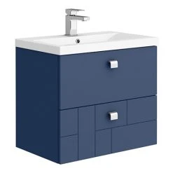 The Venice Abstract 600mm Blue 2-Drawer Wall Hung Vanity Unit features an eye-catching geometric design that will create a style statement in your bathroom. It has ample storage with two large soft-closing drawers to keep your toiletries organised. A ceramic basin slots perfectly on top and all pipework is neatly concealed within the unit. Manufactured from quality materials, this vanity unit comes fully assembled and is finished in blue satin.