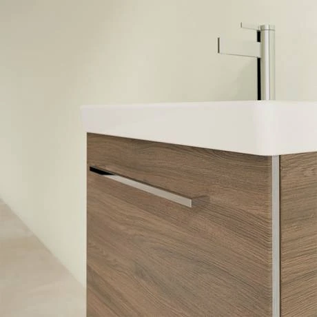 Villeroy & Boch Avento furniture is practical, beautiful and a real highlight in the bathroom. This Arizona Oak 550mm Wall Hung 1-Door Vanity Unit has generous storage space thanks to clever interior arrangement and its shock-absorbing, soft-closing door that slows down the door and automatically closes it, slowly and silently. The white ceramic basin offers a generous wash area and features a single tap hole. Visual highlights with champagne-coloured decorative edges and classy chrome handles give a light and modern look.