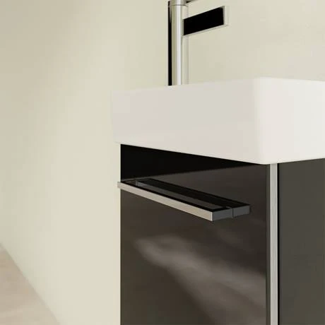 Villeroy & Boch Avento furniture is practical, beautiful and a real highlight in the bathroom. Thanks to its compact design, this Crystal Black 360mm Wall Hung Vanity Unit is ideal for cloakrooms or small bathrooms. The white ceramic basin features a right handed bowl and single tap hole. The door is fitted with soft close hinges and is available in a left or right hand opening.