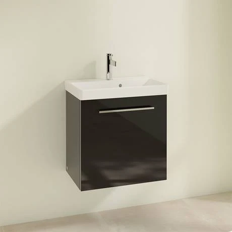 Villeroy & Boch Avento furniture is practical, beautiful and a real highlight in the bathroom. This Crystal Black 550mm Wall Hung 1-Door Vanity Unit has generous storage space thanks to clever interior arrangement and its shock-absorbing, soft-closing door that slows down the door and automatically closes it, slowly and silently. The white ceramic basin offers a generous wash area and features a single tap hole. Visual highlights with champagne-coloured decorative edges and classy chrome handles give a light and modern look.