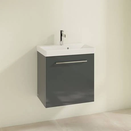 Villeroy & Boch Avento furniture is practical, beautiful and a real highlight in the bathroom. This Crystal Grey 550mm Wall Hung 1-Door Vanity Unit has generous storage space thanks to clever interior arrangement and its shock-absorbing, soft-closing door that slows down the door and automatically closes it, slowly and silently. The white ceramic basin offers a generous wash area and features a single tap hole. Visual highlights with champagne-coloured decorative edges and classy chrome handles give a light and modern look.
