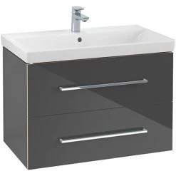 Villeroy & Boch Avento furniture is practical, beautiful and a real highlight in the bathroom. This Crystal Grey 800mm Wall Hung 2-Drawer Vanity Unit has generous storage space thanks to clever interior arrangement and its shock-absorbing, soft-closing drawers that slows down the drawer and automatically closes it, slowly and silently. The white ceramic basin offers a generous wash area and features a single tap hole. Visual highlights with champagne-coloured decorative edges and classy chrome handles give a light and modern look.