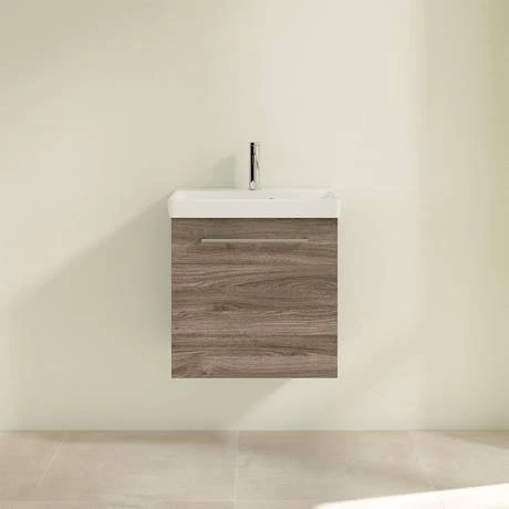 Villeroy & Boch Avento furniture is practical, beautiful and a real highlight in the bathroom. This Stone Oak 550mm Wall Hung 1-Door Vanity Unit has generous storage space thanks to clever interior arrangement and its shock-absorbing, soft-closing door that slows down the door and automatically closes it, slowly and silently. The white ceramic basin offers a generous wash area and features a single tap hole. Visual highlights with champagne-coloured decorative edges and classy chrome handles give a light and modern look.